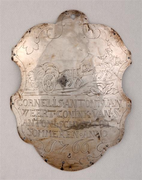 Schild met afbeelding van een wagen bespannen met twee paarden de voerman, met zweep in de rechterhand, zit op het voorste paard. Daaronder opschrift: "CORNELIS. ANTONI. VAN/ WEERT. CONINK. VAN. S:/ ANTONI. SCHUTTOT/ SOMMEREN. ANNO/ 1766" Schild heeft onregelmatige contouren rondom zijn langs de rand gaatjes aangebracht, waarmee het schild op het vest vastgezet kan worden. Langs de rand gegraveerde decoratie met lofwerk.