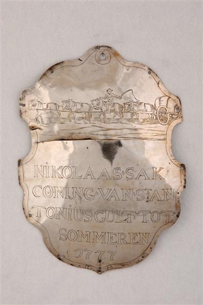 Schild met afbeelding van een wagen, bespannen met 4 paarden. Op het derde paard zit een man met zweep in de linkerhand. Daaronder opschrift: "NIKOLAAS. SAK/ CONING. VAN. ST AN/TONIUS. GULT. TOT/ SOMMEREN/ 1777" Schild heeft onregelmatige contouren rondom zijn langs de rand gaatjes aangebracht, waarmee het schild op vest vastgezet kan worden.