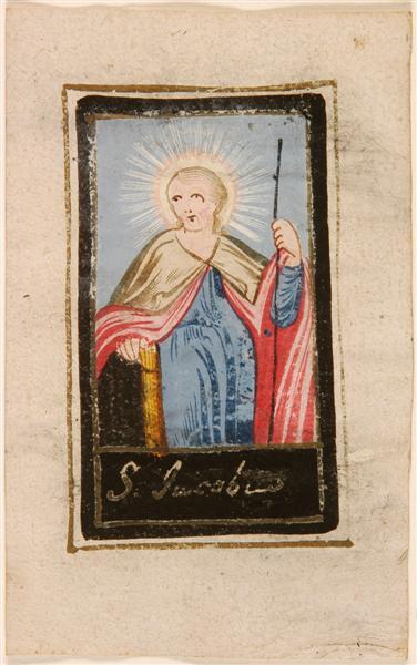 - BeschrijvingStaande heilige met stralen nimbus. Zijn rechterhand leund op een enorm boek. In de linkerhand houdt hij een staf. Tekst eronder "S Jacobus".