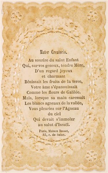 - BeschrijvingMaria zit in een zetel met armleuning. Het Christuskind zit op haar schoot. Maria legt een mand met fruit op de schoot van Christus. De tekst luidt: "MATER CREATORIS / Par Maria nous obtenons tout de Jesus". De voorstelling is gevat in een medaillon welke is omgeven door bloemenfeston en kantimitatie.