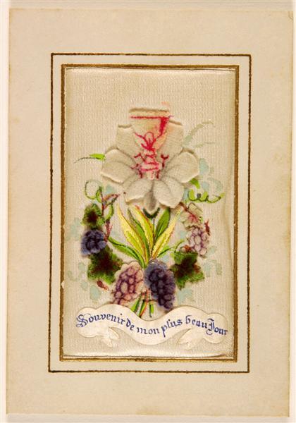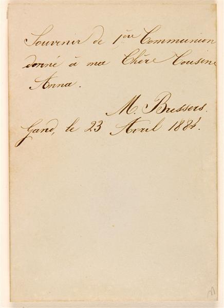 - BeschrijvingVoorstelling: een kelk ontspringt aan een lelie, welke omgeven wordt door een wijnrank en druiventrossen. De tekst op de banderol luidt: "Souvenir de mon plus beau jour". Op de achterzijde staat de tekst: "Souvenir de 1re Communion / donné à ma chère Cuisine Anna / M. Bressers / Gand, le 23 Avril 1884".
