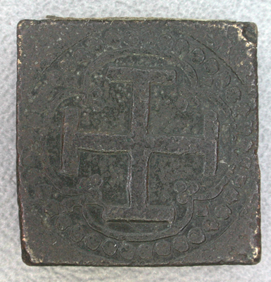 - BeschrijvingEen vierkant plat muntgewichtje, 0,2 x 1,9 x 1,9 cm, ca. 5 gram met aan een zijde in een Koggeschip in een cirkel (Nobel?).
