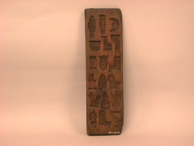 - Beschrijvingvoorkant: 1. vis 2. wikkelkind 3. maan 4. mand 5. hond 6. kat 7. ton 8. wapen van Breda 9. geit 10. vuurmand 11. druiventros 12. pelikaan 13. haan 14. buste van vrouw (edelvrouw) 15. doorboord hart 16. eikel 17. schaap 18. vogel (adelaar) Achterkant: onbewerkt
