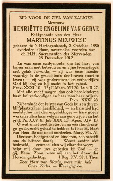 - BeschrijvingDoodsprent van Henriƫtte Engeline van Gerve (1850-1912). Voorstelling: ovaal met portret van Maria. Tekst: "Mater Dolorosa".