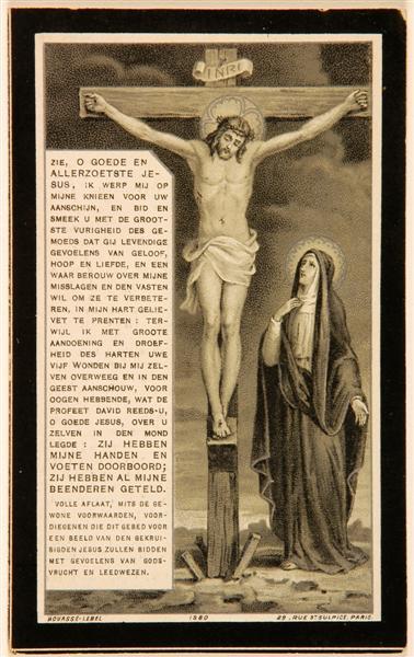 - BeschrijvingDoodsprent van Carolus Maria Thomas Rouppe van der Voort (1867-1913). Voorstelling: Maria staat naast en kijkt op naar Christus aan het kruis.
