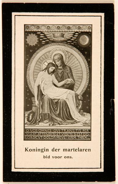 - BeschrijvingDoodsprent van Wilhelmus George Maria Lelieveld (1885-1914). Voorsteling: pieta: Maria met dode Christus op schoot.