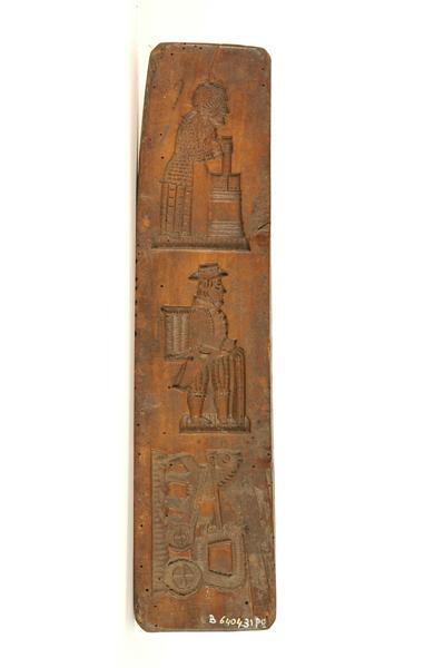 - Beschrijvingvoorkant: 1. karnster 2. marskramer 3. reiskoets met koetsier achterkant: 1. liggende koe 2. hond met mand 3. Lam Gods