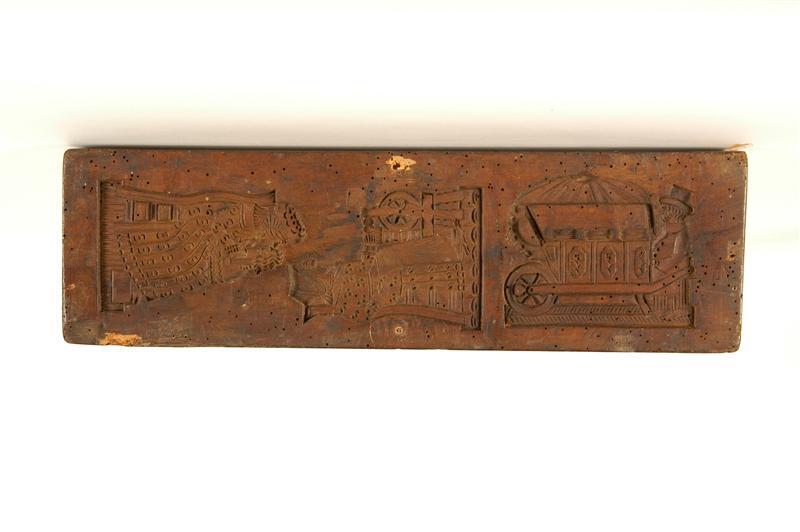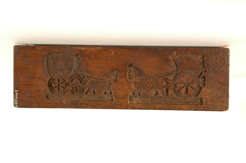 - Beschrijvingvoorkant: 1. koets, koetsier met paard 2. sjees met paard achterkant: 1. man met kar (dwars) 2. spinster (op haar kop) 3. zittende vrouw met kind op schoot