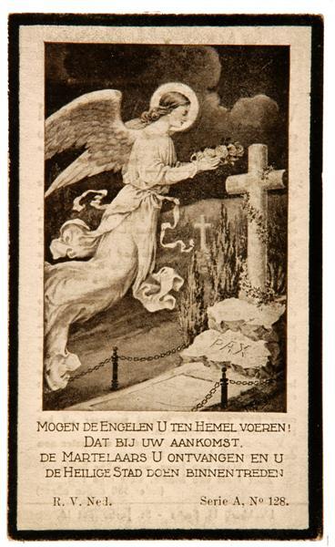 - BeschrijvingDoodsprent van Wilhelmus Johannes van Hassel (1920-1934). Voorstelling: een engel met rozenkrans in de hand zweeft boven een graf. Boven op een rots staat een kruis met de tekst "PAX".