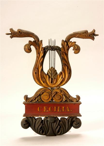 - BeschrijvingHouten bol waarop lofwerk en in een rechthoekig vlak "CECILIA" aan weerszijden. Boven lofwerk een lier van bladeren waaruit links en rechts de kop van een slang met uitgestoken tong steekt.