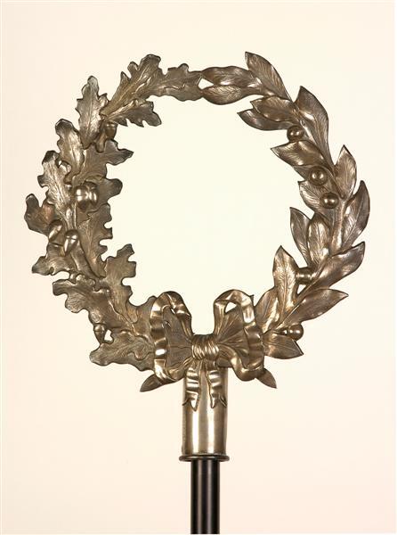- BeschrijvingVan de dienstdoende schutterij 's-Hertogenbosch. Metalen lauwerkrans bestaande uit links een eiketak en rechts een oranjetak, onderaan bijeengehouden door een metalen strik. De krans is bovenaan gesloten.