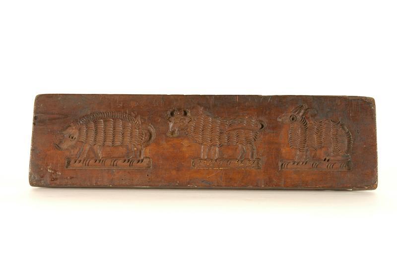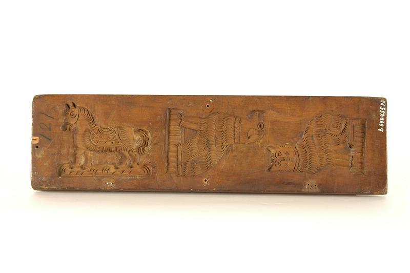 - BeschrijvingVoorkant: 1. varken 2. koe 3. haas (volgens inv.boek schaap) achterkant: 1. paard (dwars) 2. hond (op zijn kop) 3. kat