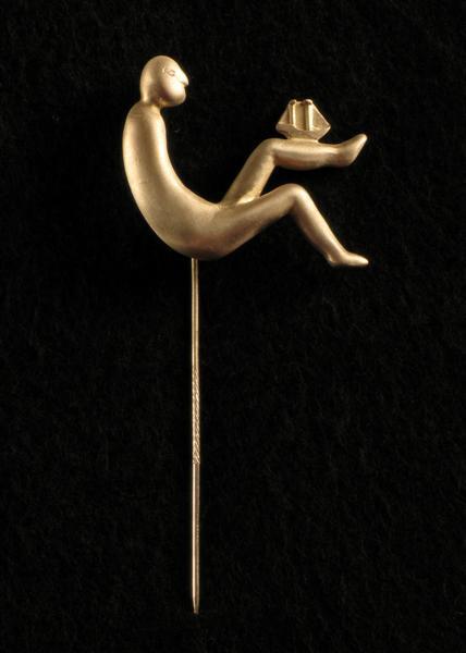 Opdracht van het Noordbrabants Museum aan Henk Visch om een speld te ontwerpen voor jubilerende vrijwilligers van het Noordbrabants Museum. Het ontwerp is naar het bronzen beeld One word leads to another door Henk Visch uit 2002, inv.nr. 15.916.