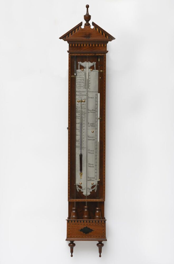 Een drie-buizenbakbarometer van eiken. De kast is gedecoreerd met marqueterie. Mogelijk met mahoniefineer. De gegraveerde schaalplaten zijn afgeschermd door een deur. De buizen zijn gevuld met kwik. De thermometer met alcohol. Er zijn diverse schaalverdelingen gegraveerd (bij de enkelvoudige buis (midden): de '36-schaal' en Engelse en Rijnlandse duimen; de contrabuis (rechts) met '36-schaal'; de thermometer (links) met Réaumur- en Fahrenheitschalen).
