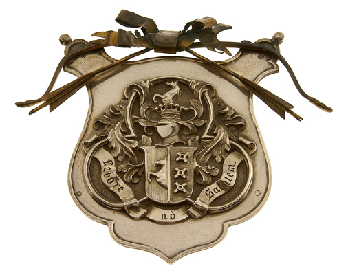 Plaquette toont aan de voorzijde een driepasmotief met een voorstelling van een wapenschild, waar onder een banderol met het opschrift: "Labore et Salutem." en waarboven een ridderhelm met kroon en half steigerend paard. De decoratie bestaat uit lofwerk. Op de plaquette is aan de bovenrand een koperen strik met een boog en twee pijlen aangebracht. Plaquette heeft onregelmatige contouren en is aan de achterzijde voorzien van een koperen plaat.