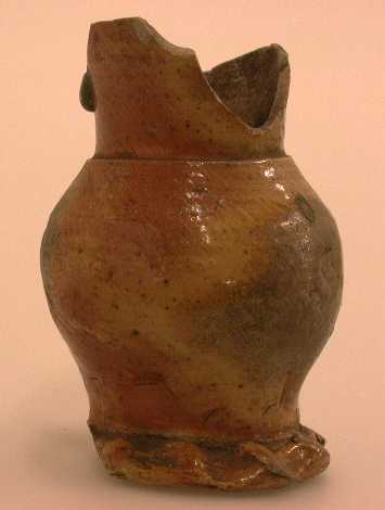 - Beschrijving- geknepen voet - bolle buik met draaigroeven - overgang naar hals door scherpe groef gemarkeerd - trechtervormige hals met klodder groen glazuur - geen oor - gedeeltelijk geel/rood gevlekt asglazuur