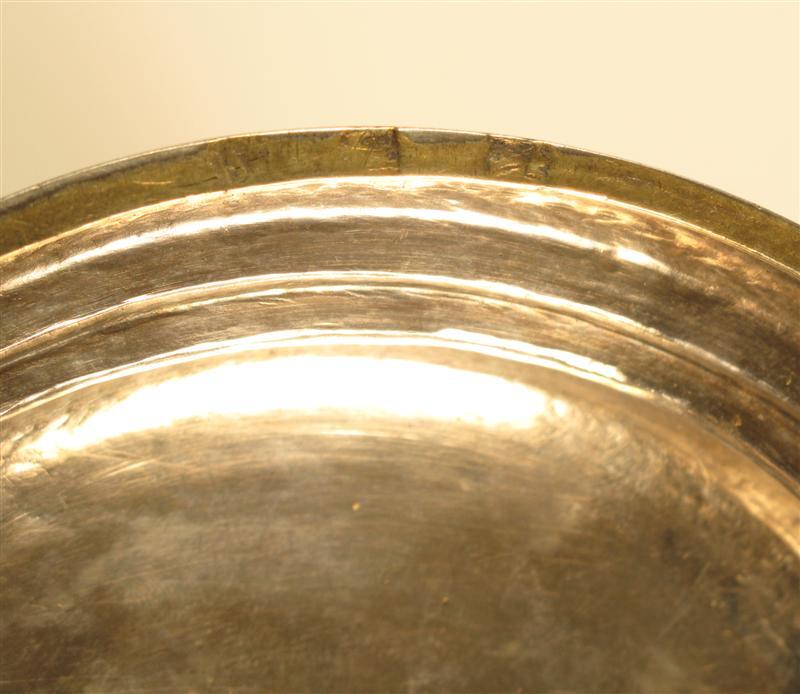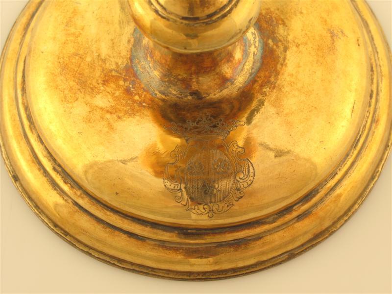 - BeschrijvingRonde, geprofileerde voet met convexe welving. Op de welving wapen in stippelgravure. Stam met peervormige nodus tussen twee ringen. Gladde, hoge cuppa.