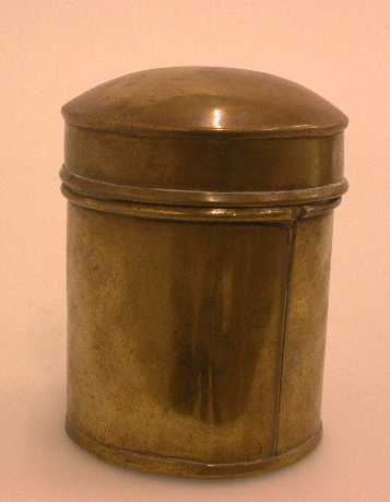 - BeschrijvingCylindrisch busje met in zicht gelaten naad en overschuivende deksel met bollende bovenzijde