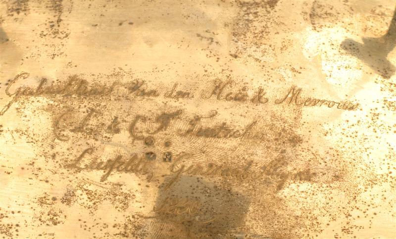 Doopbekken op vier pootjes in de vorm van een gevleugelde knaap (geperst, van achteren hol). Een opengewerkte, opstaande rand van ranken, tulp- en schildvormen. Aan de onderkant een sierrandje, aan bovenzijde een parelrandje. Komvormige spiegel. Aan de zijkanten een leeuwekop met ring in de bek. Aan de onderzijde een inscriptie, gegraveerd in schoonschrift.