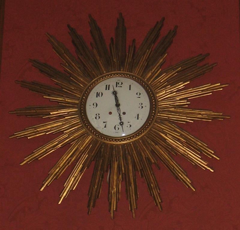 - BeschrijvingZonneklok, met uurwerk in een stralenkrans, bestaande uit twee kransen van stralen van verguld hout, het uurwerk voorzien van een parelrand.