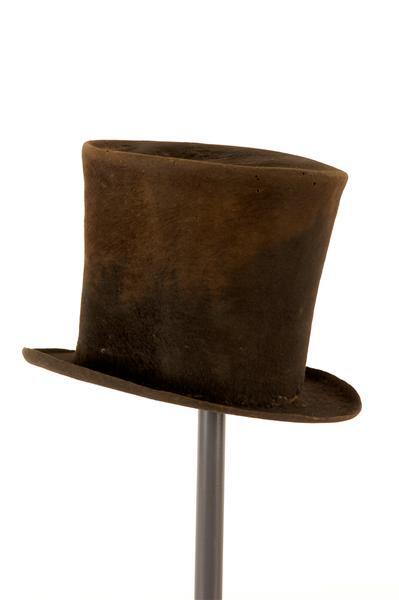 - BeschrijvingZwarte vilten hoge hoed (kastoor?). Zweetrand van zwart leer. Voering van witte glanskatoen. Bodem beplakt met bedrukt papier. Onder op de voorkant van de rand een stukje zwart leer. Opstaande rand die zich naar boven verbreedt.