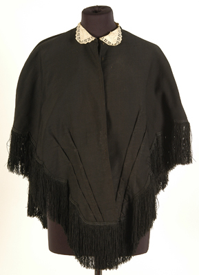 Zwarte wollen merinos pelerine. Merinos in kasimirkeper. Geschulpt afgezet met zijden franje en gevoerd met beige keperkatoen. Model breed op de schouders en naar beneden smal toelopend. In beide voorpanden 2 lange coupenaden in de taille. Op de binnenzijde 3 aan een kant opgenaaide lapjes van de voeringkatoen. Sluiting van 9 metalen haakjes en 9 trensjes. Middenvoor langs de sluiting op de voering een binnenzakje van paarse keperkatoen. Los opgenaaid een katoenen (linnen?) kraagje bestaande uit een lange band met aan beide uiteinden een punt, afgezet met een broderiekantje en op het midden van de punt een vierkant stukje broderie. Vergelijk met inv.nrs. 8758 en 10728.