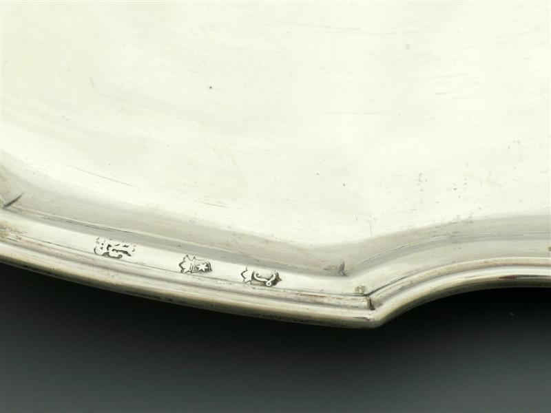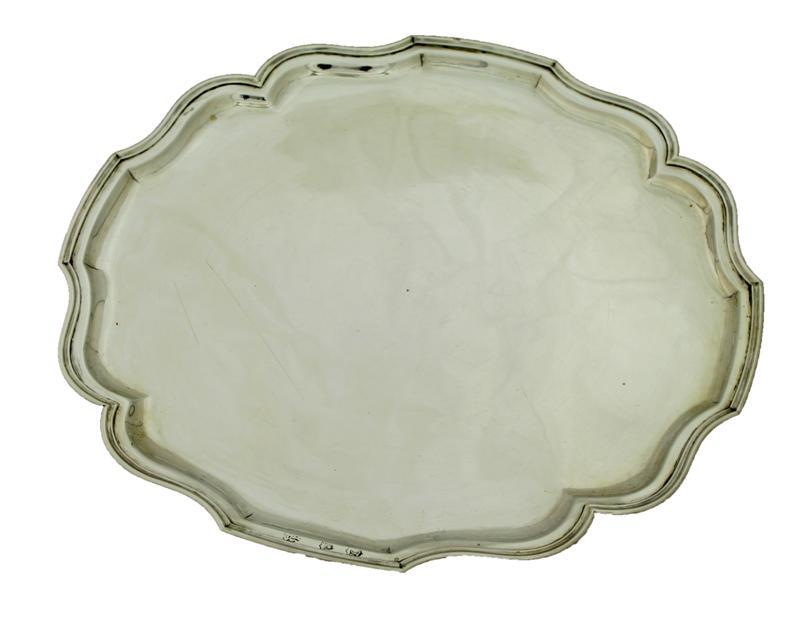 - BeschrijvingOngedecoreerd blad met een golvende en gelobde rand, staande op vier klauwpootjes.