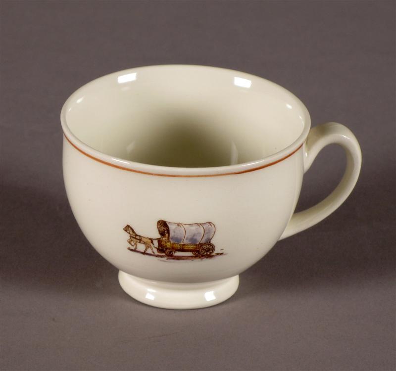 Op het kopje is een huifkar voortgetrokken door een paard afgebeeld. Aan de bovenzijde is rondom een roodbruine sierstreep aangebracht.