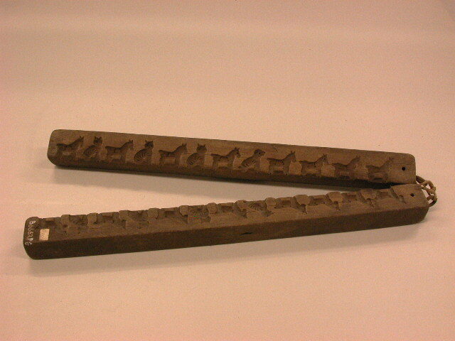 - BeschrijvingTwee identieke planken met touw, dat door haken in de bovenkant gaat, verbonden. Boven en opzij: gaten voor een pen Binnenkanten: 1. paard 2. kat 3. paard 4. kat 5. paard 6. kat 7. paard 8. hond 9. paard 10. paard 11. paard 12. paard