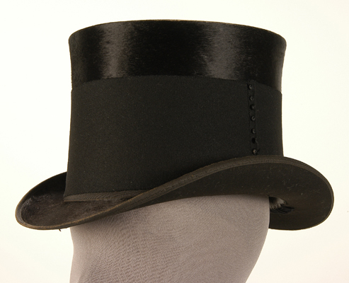 Zwarte zijden hoed. Normaal model met zwart zijden geribd bollint en zwarte metalen gesp. Daaroverheen een 9 cm brede wollen rouwband (schuin geknipt), aan een zijde dichtgenaaid en versierd met (waarschijnlijk) 10 hele kleine zwarte zijden knoopjes. Zwart zijden riblint als boorlint aan de rand. Band gevoerd met zwarte wollen stof. Langs de binnenrand bruin hoedenleer. Kap van wit papier. Bodem van kap met ingeperst bandpatroon, zijkant glad. Onder een klein gedeelte van het hoedenlees een los kurken bandje (ter verkleining). Op het linnen van de pas met krijt geschreven "57" en "6", enkele onleesbare cijfers en "Sr" (?). Op de bodem onleesbare tekens.