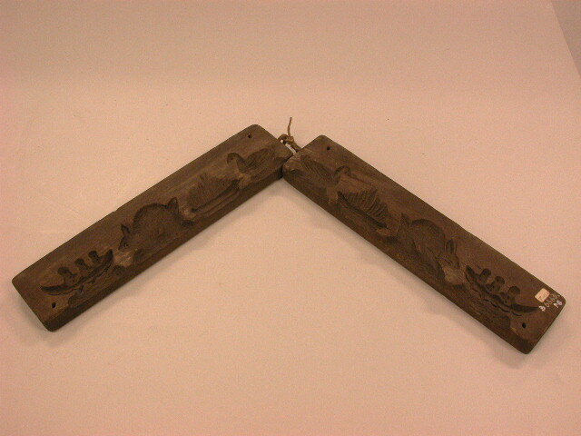 - BeschrijvingTwee identieke planken verbonden met touw, door twee haken aan de bovenkanten. Gaten van onderen en van boven voor pennen. Binnenkanten 1. eend 2. zeilboot 3. haas 4. schip
