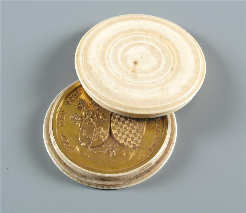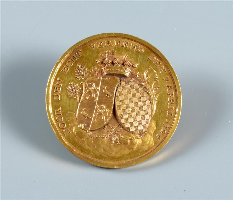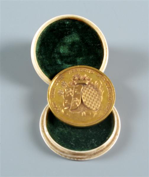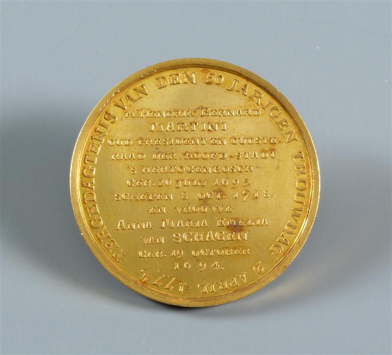 - TitelGouden penning ter ere van het 50-jarig huwelijk van H.B. Martini en A.M.E. van Schagen, in een ivoren doosje