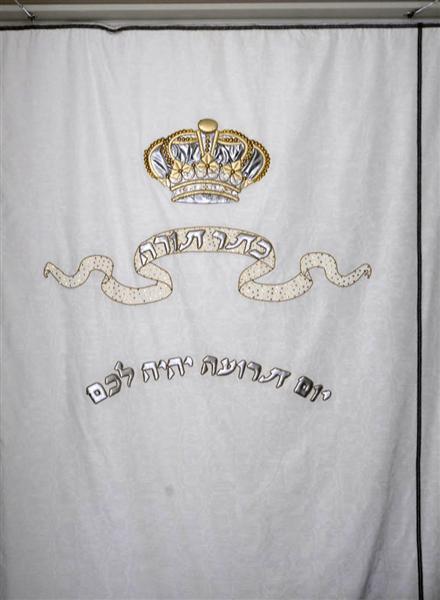 - BeschrijvingNieuwe voorhang van wit synthetisch fluweel met geappliqueerde kroon en banderol met Hebreeuwse teksten.