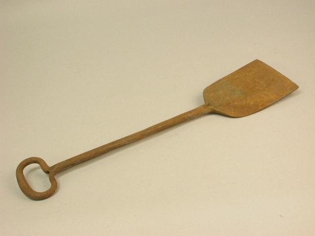 Langwerpig rechthoekig blad, overgaand in ronde steel met ovaalvormig handvat, alles in één lijn. Om deeg uit de trog te steken.