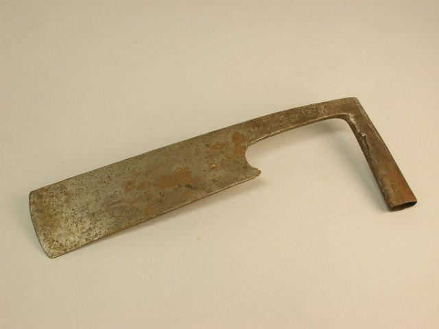 - BeschrijvingLangwerpig, rechthoekig mesblad met snijvlak aan de kopse voorzijde. De andere kopse zijde, op 32 cm afstand, overgaand in smalle "steel", eindigend in kokervormige houder voor houten steel onder een hoek van 90ยบ, parallel aan het snijvlak