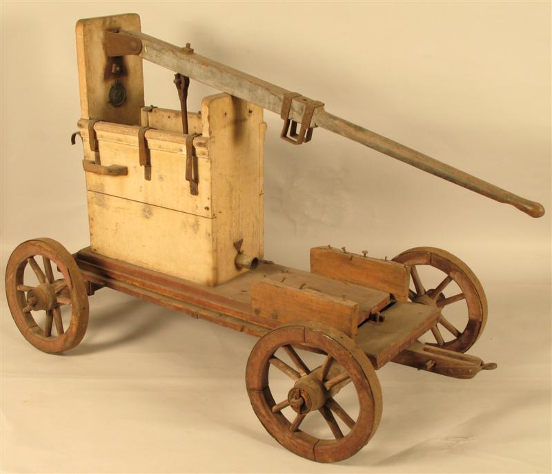 Kar met brandspuit met handpomp met hefboom mechaniek en trekbalk