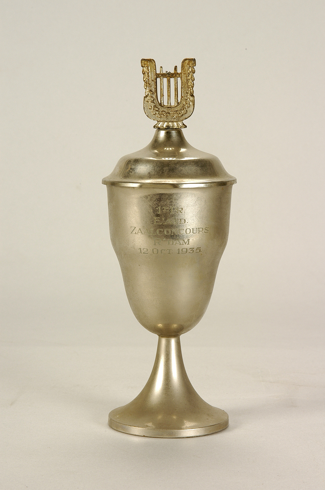 - BeschrijvingTekst op beker: 1ePr. E'AFD. ZAALCONCOURS R'DAM 12 OCT. 1935