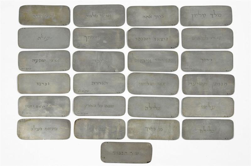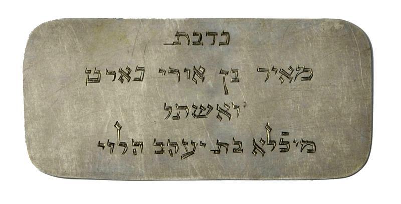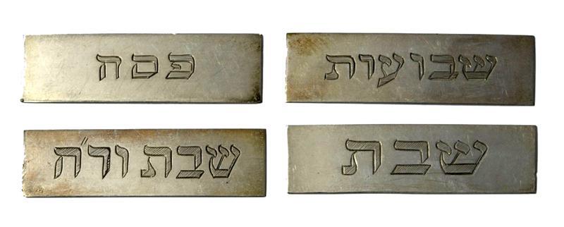 Houten doosje met daarin 25 zilveren plaatjes, rechthoekig met afgeronde hoeken en een sierrandje. Hoofdzakelijk voor Rosh ha-Shanah, Yom Kippur en Shabbat. Op beide zijden is een Hebreeuwse tekst gegraveerd, op de voorzijde de Mitswot, op de achterzijde de naam van de schenker. In het doosje zijn tevens papieren oproepplaatjes beschreven met blauwe inkt en vier moderne zilveren plaatjes ter identificatie van Sifre Torah, met eenzijdige Hebreeuwse inscriptie.