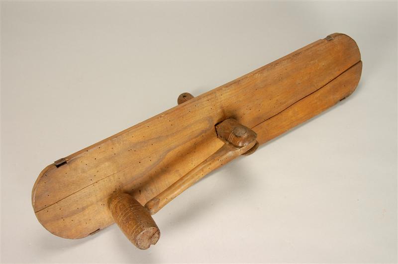 - BeschrijvingCentraal door beukehouten plank met afgeronde hoeken gestoken perehouten handvat met in top ingelaten, rond ijzeren pin scharnierende perehouten hamer