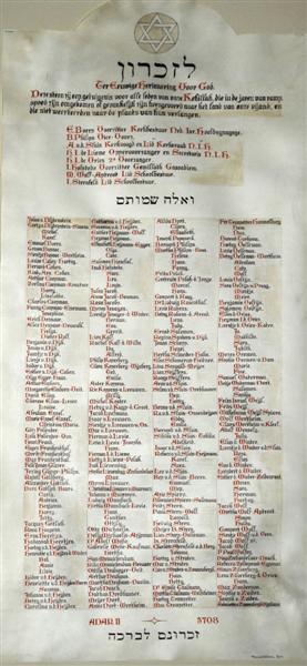- BeschrijvingIngelijst perkament blad met in voornamelijk rode en zwarte inkt gekalligrafeerd de namen van de in de oorlog vermoorde lidmaten van de Joodse Gemeente Den Bosch en midden boven een davidster in een cirkel.