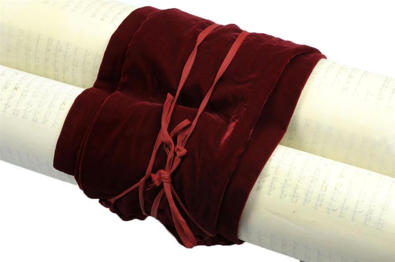 - BeschrijvingTorawikkel van rood fluweel met rode linten en voering van rode katoen.