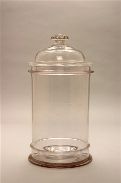 - BeschrijvingGrote glazen pot met voet en sierrand en aan bovenzijde een naad. Deksel met sierknop, vertikale rand (die in de pot valt) en horizontale rand die op de pot rust.
