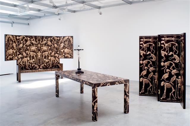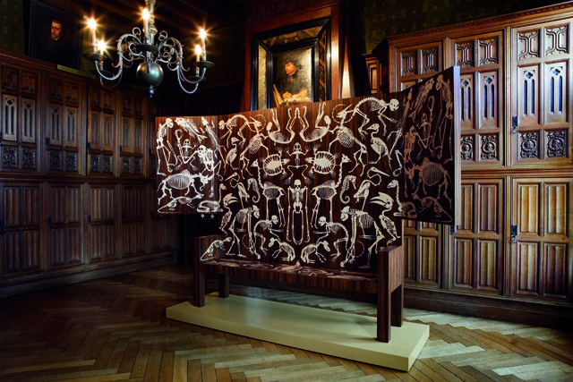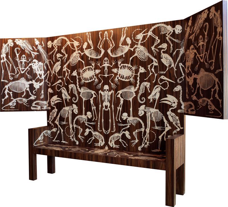 een kist en een kast. Deze meubels zijn uitgevoerd in kostbare tropische houtsoorten en versierd met een grafisch patroon van skeletten van dieren, ingelegd door gespecialiseerde meubelmakers.