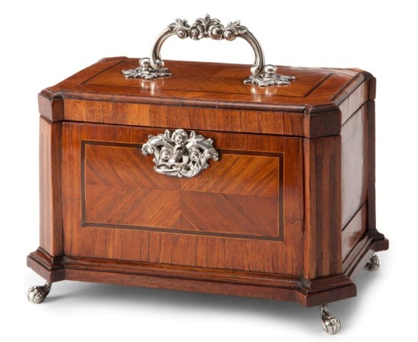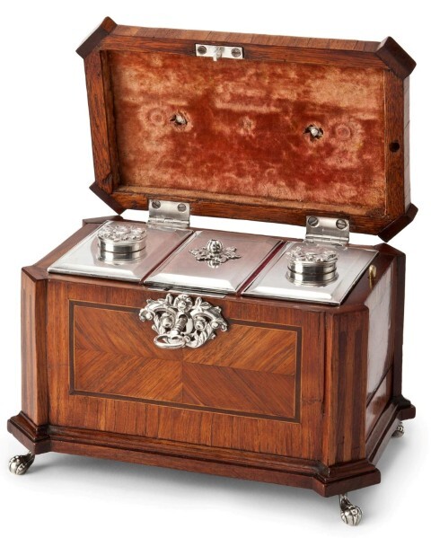 De kist is met mahonie, satijn, rozen, amaranth en buxux gefineerd op een eikenhouten kern en is gemonteerd met een gegoten beweegbare zilveren handgreep, bestaande uit c-voluten en bloemen en een zilveren slotplaat met dezelfde motieven. Het geheel staat op vier zilveren bal- en klauwpootjes. In de drie compartimenten bevinden zich drie gladde, rechthoekige zilveren bussen, waarvan twee voorzien van een afneembare zilveren dop. Deze twee hebben tevens een scharnierend deksel. De derde bus in het midden, de zogenoemde mengbus, heeft slechts een scharnierend deksel. Alle drie de bussen zijn geappliqueerd met een rozet van bladwerk. Voorzien van een zilveren sleutel. Gemerkt op de onderzijde van de bussen en voorzien van trembleersteken aan de binnenkant van de bodem van de bussen. De bussen zijn ook gemerkt met het gekroonde keur A uit de Bataafse tijd sinds 1800.De zilveren theebusjes zijn alle gelijkvormig en met dezelfde profielranden afgewerkt. De bladvormige ornamenten op de deksels zijn gegoten en geciseleerd. De rugzijde van het geaplliqueerde ornament is goed te zien aan de binnenzijde van de deksels. Deze rozetten zijn ook gegoten en hebben in het midden een verlaging. De rozetten zijn gemerkt met I en II. Deze nummering komt ook voor op de balstervormige knoppen waartussen het hengsel beweegt. Zeer interessant is te zien dat de rozetten die onder het beweegbaar hengsel op de deksel zitten gelijk zijn aan de rozettenornamenten op de deksels van de busjes. Door de losse rozet op een van de deksels te plaatsen is te zien dat beide uit dezelfde gietmal zijn. Het enige verschil is dat de uitstekende delen zijn weggezaagd met behoud van het ornament.