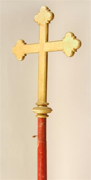 Boven op stok verguld houten klaverkruis op dito klos.Behorend bij processievaandel van de Godshuizen. Vermoedelijk behorend bij inv.nr. 11474.