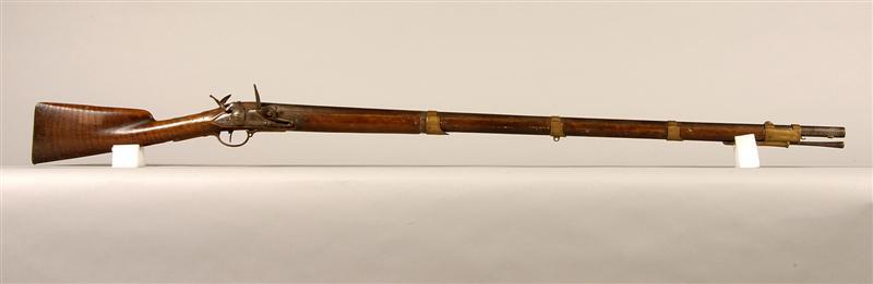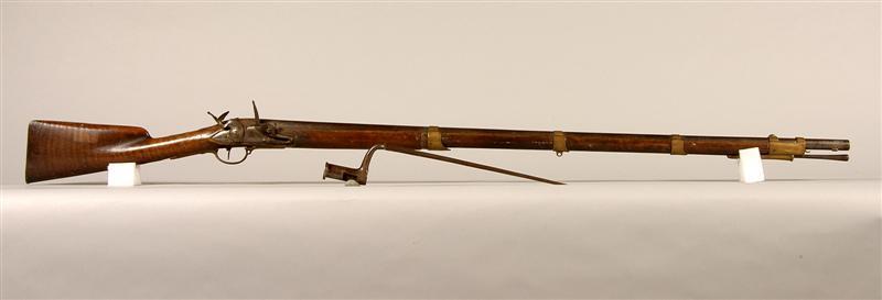 - BeschrijvingVuursteengeweer voor officier met schachtbajonet zonder stormring. Met versierde koperen banden.