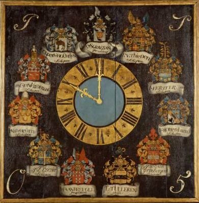 Wijzerplaat met de wapens van de president, schepenen, pensionaris en griffier der stad in 1705, uit de schepenkamer van het stadhuis van 's-Hertogenbosch. In het midden een wijzerplaat met wijzers. Op de wijzerplaat staan de familiewapens van de in 1705 in functie zijnde schepenen afgebeeld, alsmede die van de belangrijkste ambtenaren. Wapens van schepenen Dirk van 's-Gravensande president, Mr. Conraedt Cuper van Holthuysen, Philip van Thienen, heer van Berlicum, Cornelis van Vrijberghen, Mr. Isaac Verster, Mr. Johan van Heurn, Francois van Rotterdam, Isaak Elzevier en Gerrit Wilhelm van Grimberghen, J.F. van Breugel, pensionaris, E. Tulleken, griffier.