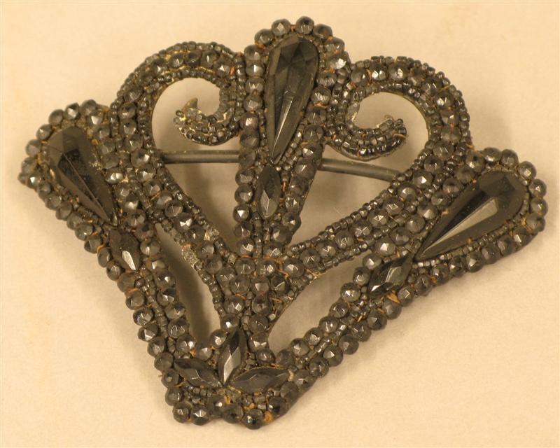 - BeschrijvingVier zwarte haarkammen, een zwarte haarklem en een zwarte halsketting, gedragen tijdens de rouwperiode, alsmede een bruine haarkam, haarspelden en twee hoedepennen, allen omstreeks 1890 gedragen te Ravenstein
