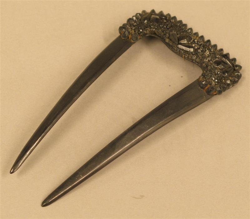 - BeschrijvingVier zwarte haarkammen, een zwarte haarklem en een zwarte halsketting, gedragen tijdens de rouwperiode, alsmede een bruine haarkam, haarspelden en twee hoedepennen, allen omstreeks 1890 gedragen te Ravenstein