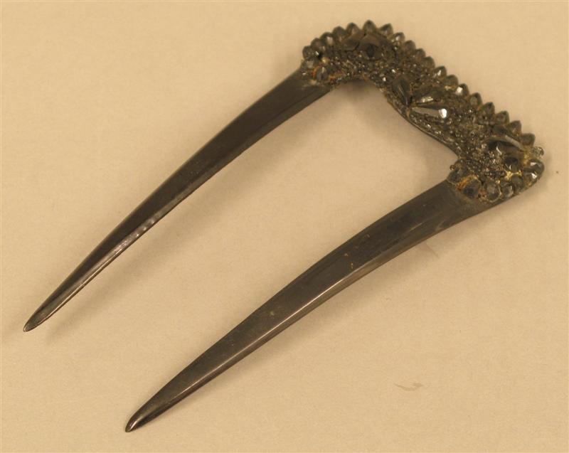 - BeschrijvingVier zwarte haarkammen, een zwarte haarklem en een zwarte halsketting, gedragen tijdens de rouwperiode, alsmede een bruine haarkam, haarspelden en twee hoedepennen, allen omstreeks 1890 gedragen te Ravenstein